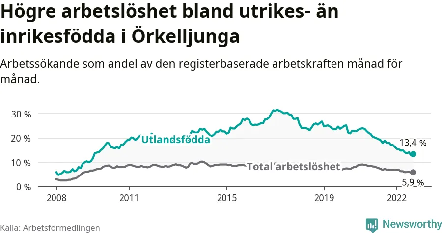 Arbetslösheten bland utlandsfödda var 13,4 procent i Örkelljunga under september månad, motsvarande 121 av 903 personer. Det är 4,7 procentenheter färre än vid samma tidpunkt i fjol (−45 om man räknar personer). Därmed är de utlandsföddas arbetslöshet lägre än vid samma tidpunkt i fjol för 24:e månaden i följd. Sedan september 2020 har arbetslösheten bland utlandsfödda minskat från 23,8 till 13,4 procent.