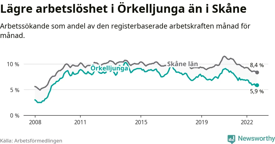 Under september månad rapporterade Örkelljunga kommun en total arbetslöshet på 5,9 procent. Det är en minskning jämfört med samma tidpunkt i fjol (−1,1 procentenheter). Även i Skåne län sjunker arbetslösheten .