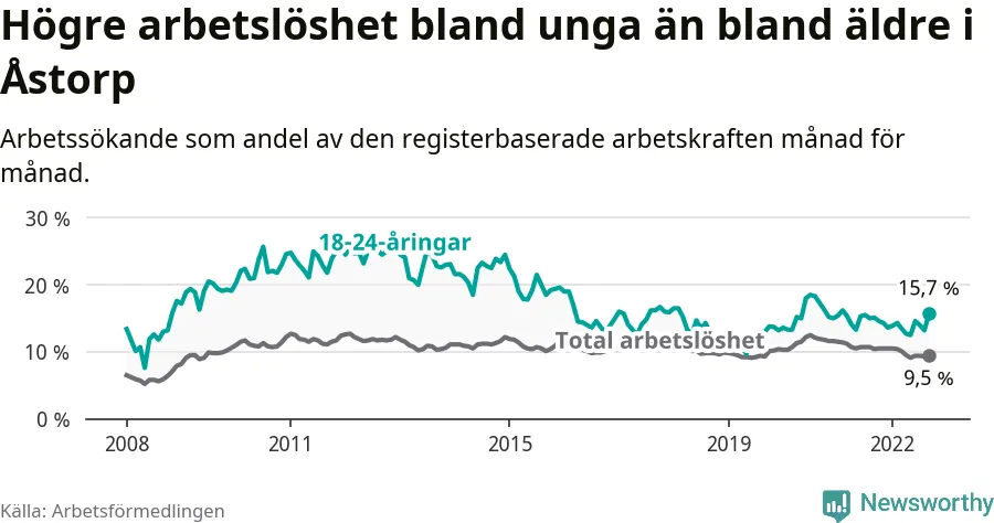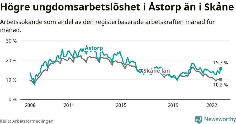 Precis som den totala arbetslösheten ligger ungdomsarbetslösheten i Åstorp högre än i Skåne som helhet. Skillnaden mellan kommunen och länet är 5,5 procentenheter.