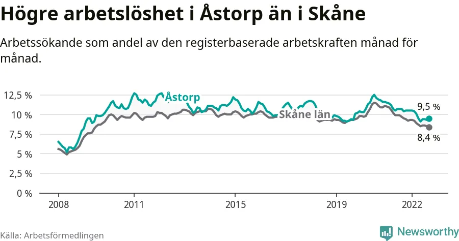 Det är 18:e månaden i följd som arbetslösheten i Åstorp är lägre än den var under samma tidpunkt året innan. Sedan mars 2021 har arbetslösheten gått ner från 11,2 till 9,5 procent.