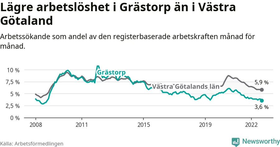 Det är 18:e månaden i följd som arbetslösheten i Grästorp är lägre än den var under samma tidpunkt året innan. Sedan mars 2021 har arbetslösheten gått ner från 5,3 till 3,6 procent. Den nuvarande arbetslöshetsnivån är därmed den lägsta sedan oktober 2008.