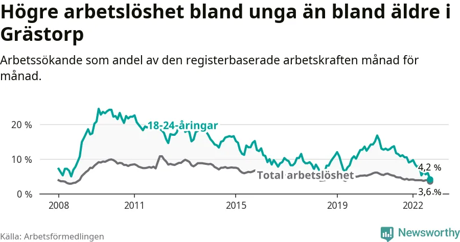 I och med den senaste månadens nedgång har de ungas arbetslöshet i Grästorp sjunkit 17 månader i följd (ner från 13,7 procent i april 2021 till 4,2 procent nu). Den nuvarande arbetslöshetsnivån är den lägsta sedan januari 2008.