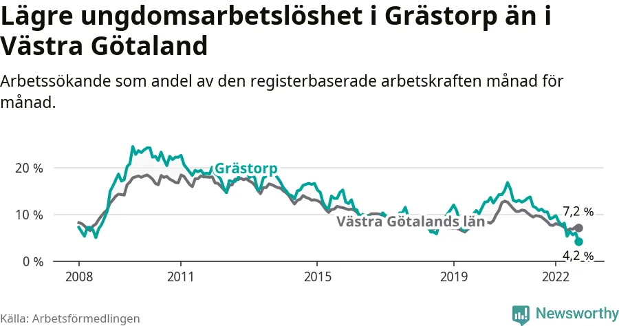 Precis som den totala arbetslösheten ligger ungdomsarbetslösheten i Grästorp lägre än i Västra Götaland som helhet. Skillnaden mellan kommunen och länet är 3,0 procentenheter.