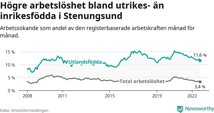 Skillnaden i arbetslöshet mellan utrikesfödda och hela befolkningen är 8,2 procentenheter i Stenungsund. Det är en mindre skillnad än för ett år sedan (−0,7 procentenheter).
