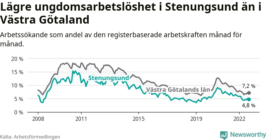 Precis som den totala arbetslösheten ligger ungdomsarbetslösheten i Stenungsund lägre än i Västra Götaland som helhet. Skillnaden mellan kommunen och länet är 2,4 procentenheter.