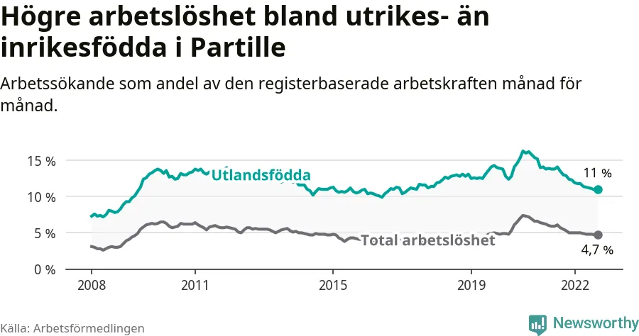 Arbetslösheten bland utlandsfödda var 11,0 procent i Partille under september månad, motsvarande 517 av 4 700 personer. Det är 2,0 procentenheter färre än vid samma tidpunkt i fjol (−90 om man räknar personer). Därmed är de utlandsföddas arbetslöshet lägre än vid samma tidpunkt i fjol för 18:e månaden i följd. Sedan mars 2021 har arbetslösheten bland utlandsfödda minskat från 13,8 till 11,0 procent.