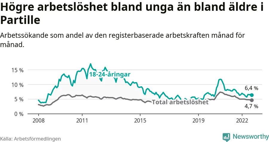 I och med den senaste månadens nedgång har de ungas arbetslöshet i Partille sjunkit 18 månader i följd (ner från 8,1 procent i mars 2021 till 6,4 procent nu).