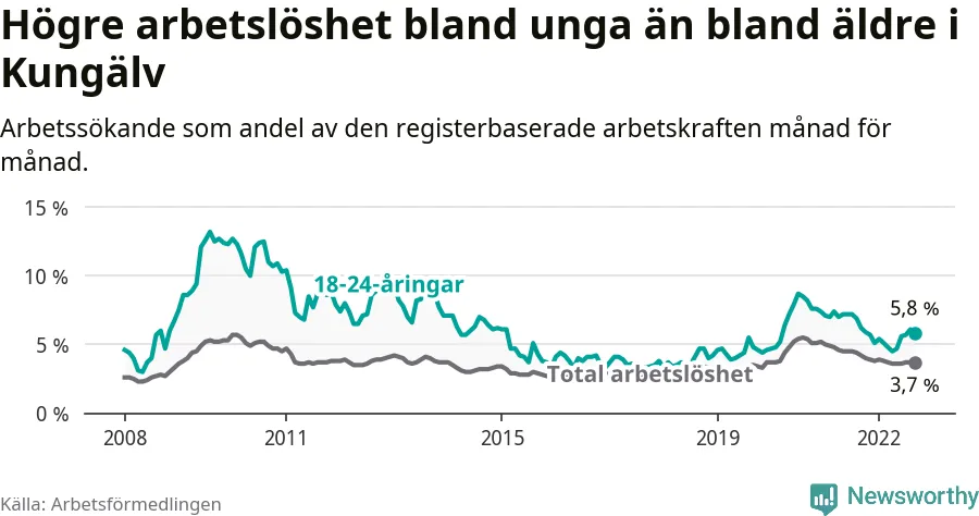 Precis som den totala arbetslösheten ligger ungdomsarbetslösheten i Kungälv lägre än i Västra Götaland som helhet. Skillnaden mellan kommunen och länet är 1,4 procentenheter.