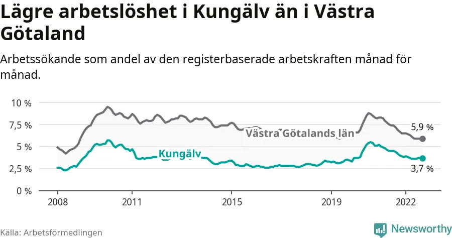 Under september månad rapporterade Kungälvs kommun en total arbetslöshet på 3,7 procent. Det är en minskning jämfört med samma tidpunkt i fjol (−0,5 procentenheter). Även i Västra Götalands län sjunker arbetslösheten .