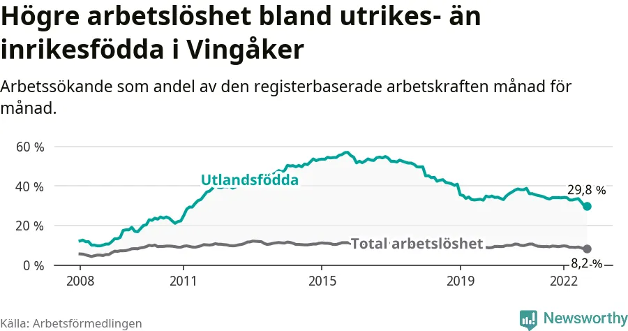 Arbetslösheten bland utlandsfödda var 29,8 procent i Vingåker under september månad, motsvarande 169 av 567 personer. Det är 4,3 procentenheter färre än vid samma tidpunkt i fjol (−38 om man räknar personer). Därmed är de utlandsföddas arbetslöshet lägre än vid samma tidpunkt i fjol för 16:e månaden i följd. Sedan maj 2021 har arbetslösheten bland utlandsfödda minskat från 34,9 till 29,8 procent. Den nuvarande arbetslöshetsnivån är den lägsta sedan april 2011.