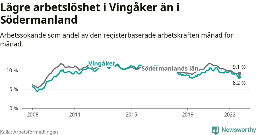 Det är 17:e månaden i följd som arbetslösheten i Vingåker är lägre än den var under samma tidpunkt året innan. Sedan april 2021 har arbetslösheten gått ner från 9,5 till 8,2 procent.