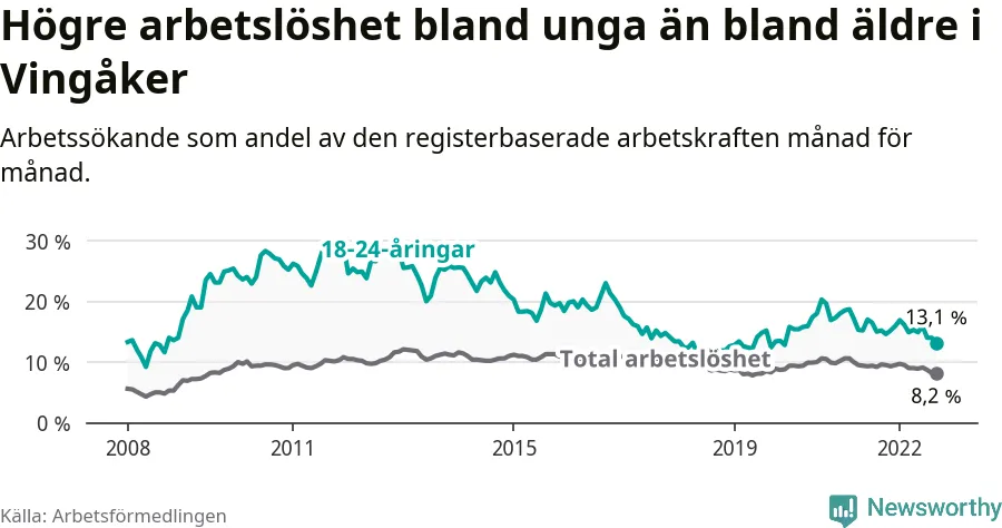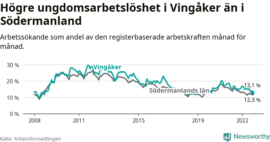 Medan Vingåker har lägre total arbetslöshet än Södermanland, ligger ungdomsarbetslösheten 0,8 procentenheter högre i Vingåker.