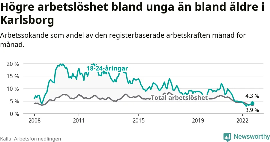 I och med den senaste månadens nedgång har de ungas arbetslöshet i Karlsborg sjunkit 19 månader i följd (ner från 9,3 procent i februari 2021 till 4,3 procent nu).