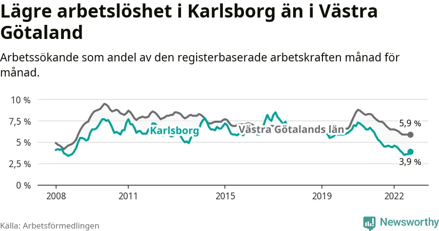 Graf: Arbetslöshet i Karlsborgs kommun och Västra Götalands län