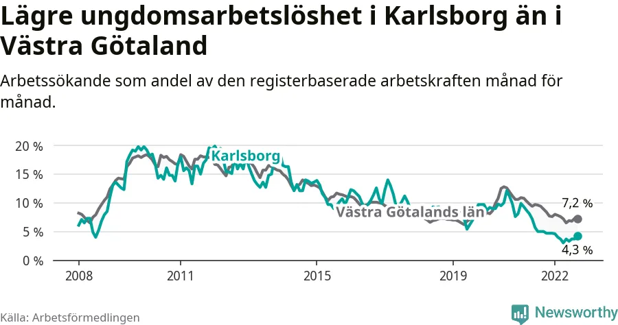 Graf: Arbetslöshet bland unga i Karlsborgs kommun och Västra Götalands län
