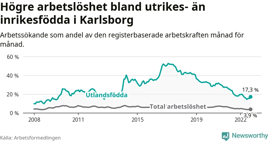 Arbetslösheten bland utlandsfödda var 17,3 procent i Karlsborg under september månad, motsvarande 47 av 272 personer. Det är 0,9 procentenheter färre än vid samma tidpunkt i fjol (−2 om man räknar personer). Därmed har de utlandsföddas arbetslöshet varit lägre än vid samma tidpunkt i fjol i över fem år i sträck. Sedan augusti 2017 har arbetslösheten bland utlandsfödda minskat från 49,3 till 17,3 procent.