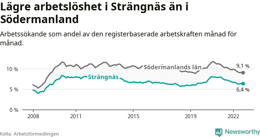 Under september månad rapporterade Strängnäs kommun en total arbetslöshet på 6,4 procent. Det är en minskning jämfört med samma tidpunkt i fjol (−0,7 procentenheter). Även i Södermanlands län sjunker arbetslösheten .