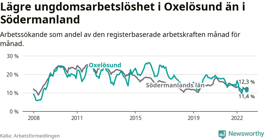 Precis som den totala arbetslösheten ligger ungdomsarbetslösheten i Oxelösund lägre än i Södermanland som helhet. Skillnaden mellan kommunen och länet är 0,9 procentenheter.
