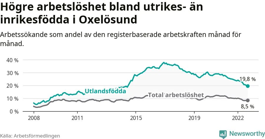 Skillnaden i arbetslöshet mellan utrikesfödda och hela befolkningen är 11,3 procentenheter i Oxelösund. Det är en betydligt mindre skillnad än för ett år sedan (−3,4 procentenheter).