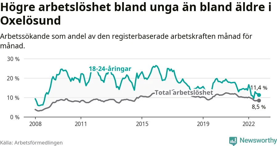 Det är 18:e månaden i följd som arbetslösheten i Oxelösund är lägre än den var under samma tidpunkt året innan. Sedan mars 2021 har arbetslösheten gått ner från 11,7 till 8,5 procent.