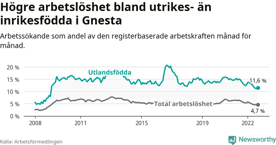 Skillnaden i arbetslöshet mellan utrikesfödda och hela befolkningen är 6,9 procentenheter i Gnesta. Det är en mindre skillnad än för ett år sedan (−0,8 procentenheter).