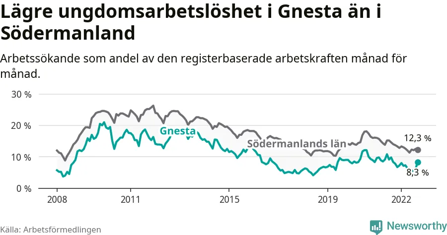 Precis som den totala arbetslösheten ligger ungdomsarbetslösheten i Gnesta lägre än i Södermanland som helhet. Skillnaden mellan kommunen och länet är 4,0 procentenheter.