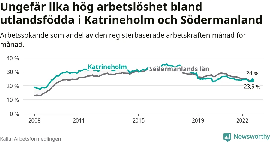 Arbetslösheten bland utlandsfödda var 24,0 procent i Katrineholm under september månad, motsvarande 904 av 3 767 personer. Det är 0,3 procentenheter färre än vid samma tidpunkt i fjol (+3 om man räknar personer). Därmed är de utlandsföddas arbetslöshet lägre än vid samma tidpunkt i fjol för 15:e månaden i följd. Sedan juni 2021 har arbetslösheten bland utlandsfödda minskat från 25,1 till 24,0 procent.