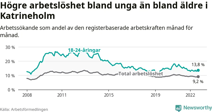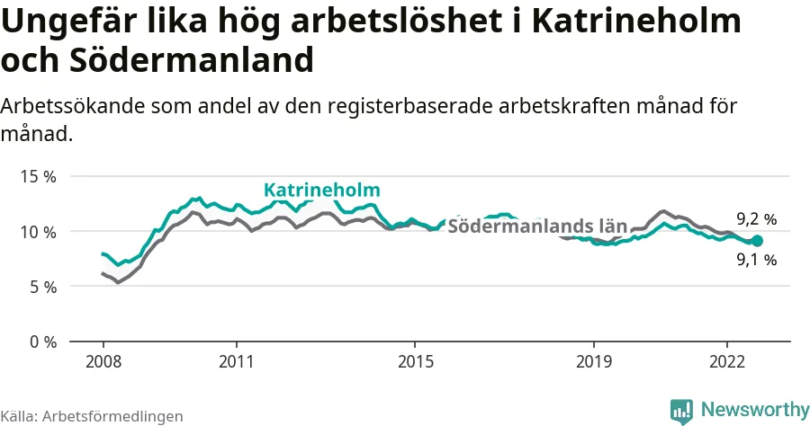 Medan Katrineholm har ungefär samma total arbetslöshet som Södermanland, ligger ungdomsarbetslösheten 1,5 procentenheter högre i Katrineholm.
