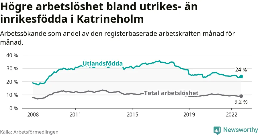 Skillnaden i arbetslöshet mellan utrikesfödda och hela befolkningen är 14,8 procentenheter i Katrineholm. Det är ungefär samma skillnad som för ett år sedan.