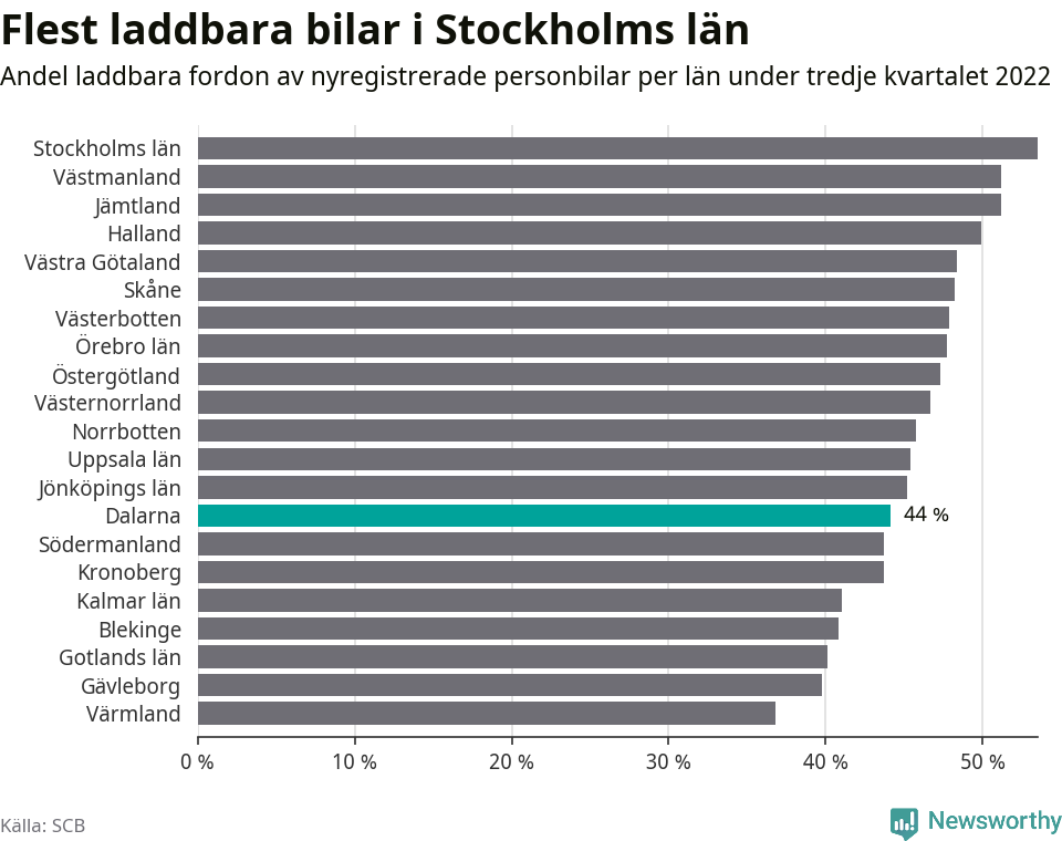 I hela landet var 49 procent av alla nya bilar laddbara under tredje kvartalet. Det är framför allt Stockholms län som drar upp snittet, vilket till stor del förklaras av att många leasingföretag har sitt säte i länet. I Dalarnas län var 44 procent av nyregistrerade bilar laddbara.