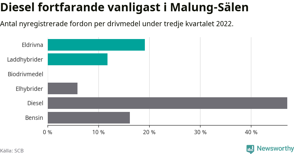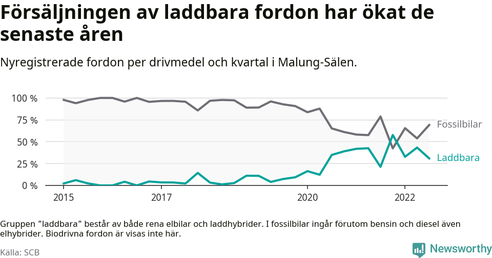 Under tredje kvartalet 2022 var 31 procent av alla nyregistrerade personbilar i Malung-Sälen laddbara (sammanlagt registrerades 68 nya bilar). Av dessa laddbara fordon var 62 procent rena elbilar. De resterande var så kallade laddhybrider, det vill säga fordon som går att ladda och köra på el, men som även har en förbränningsmotor.