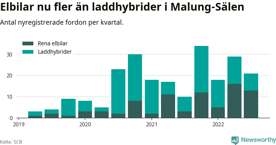 I Malung-Sälen var andelen laddbara bilar under tredje kvartalet också lägre än under fjärde kvartalet 2021 då rekordet hittills noterades (58 procent).