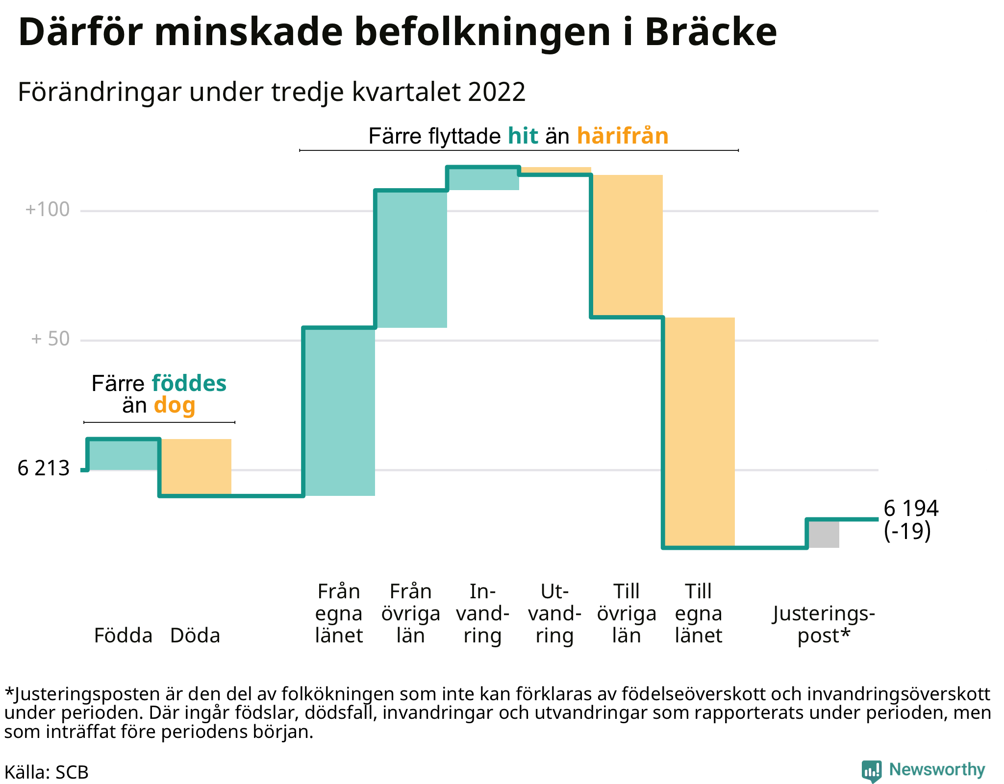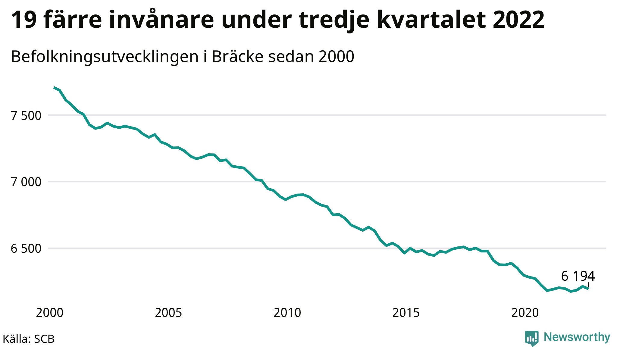 Fler dog än föddes i Bräcke kommun under tredje kvartalet 2022 och fler flyttade från än till kommunen. Befolkningen minskade med 19 personer jämfört med kvartalet innan. Därmed har Bräcke 6 194 invånare.