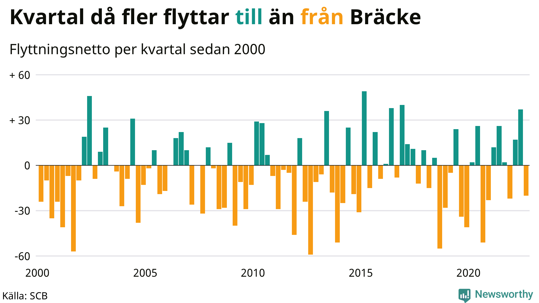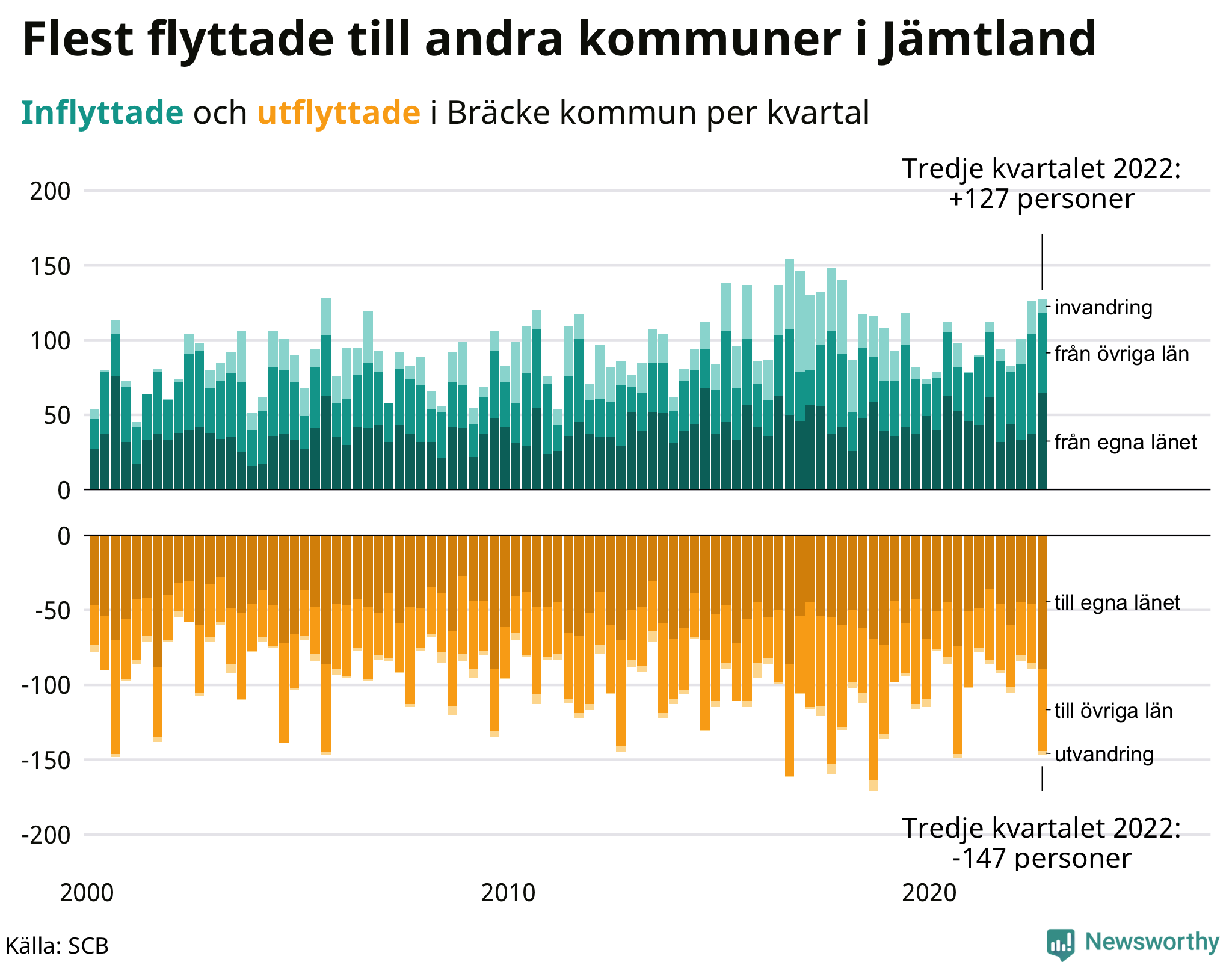 Under det tredje kvartalet flyttade 127 personer till Bräcke medan 147 flyttade ut. Kommunen hade med andra ord ett negativt flyttnetto.