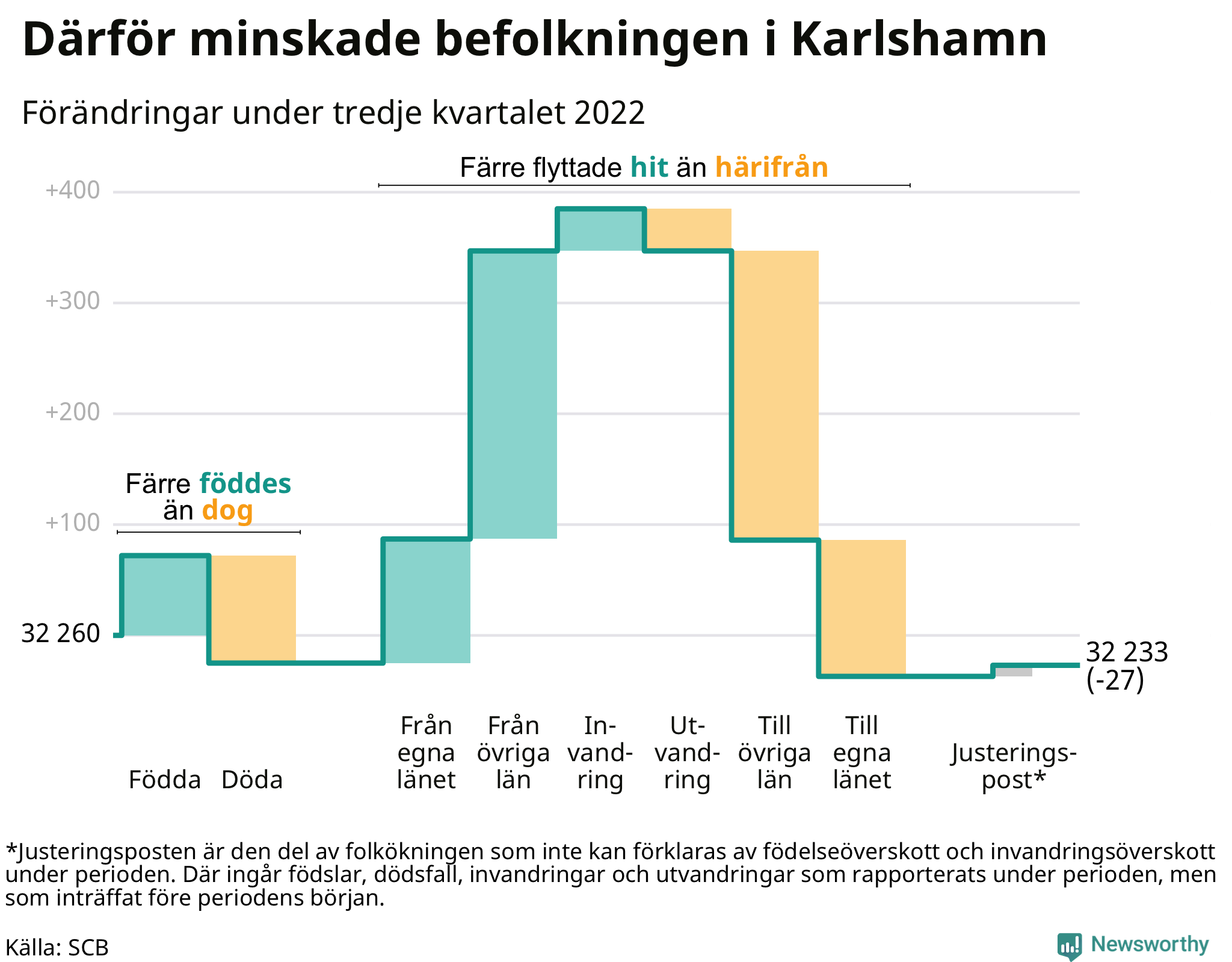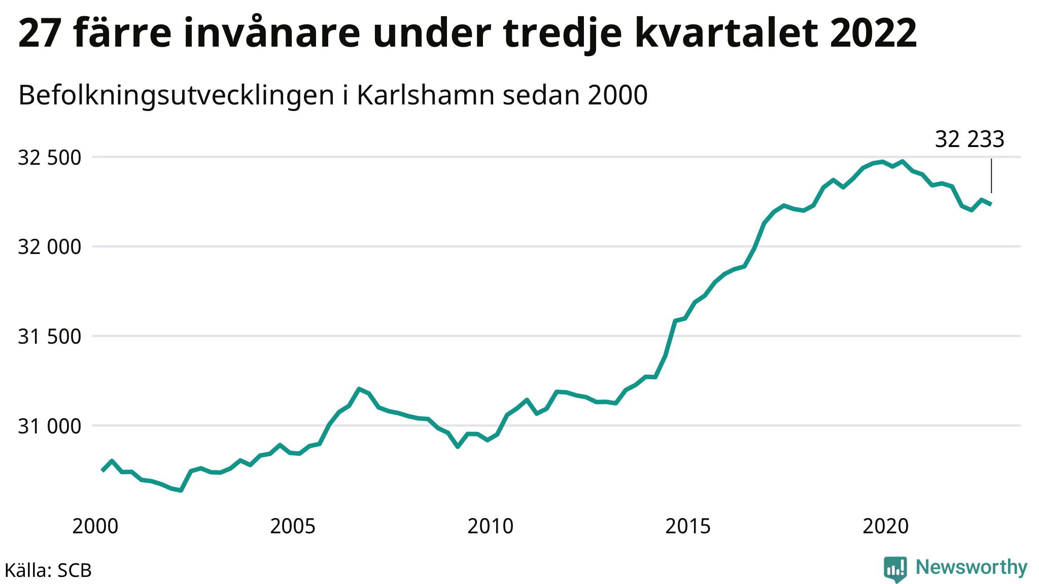 Fler dog än föddes i Karlshamns kommun under tredje kvartalet 2022 och fler flyttade från än till kommunen. Befolkningen minskade med 27 personer jämfört med kvartalet innan. Därmed har Karlshamn 32 233 invånare.