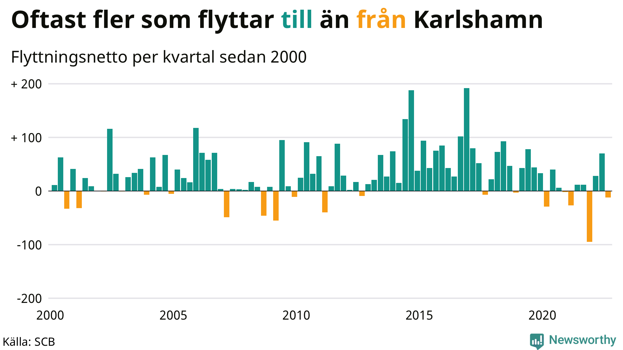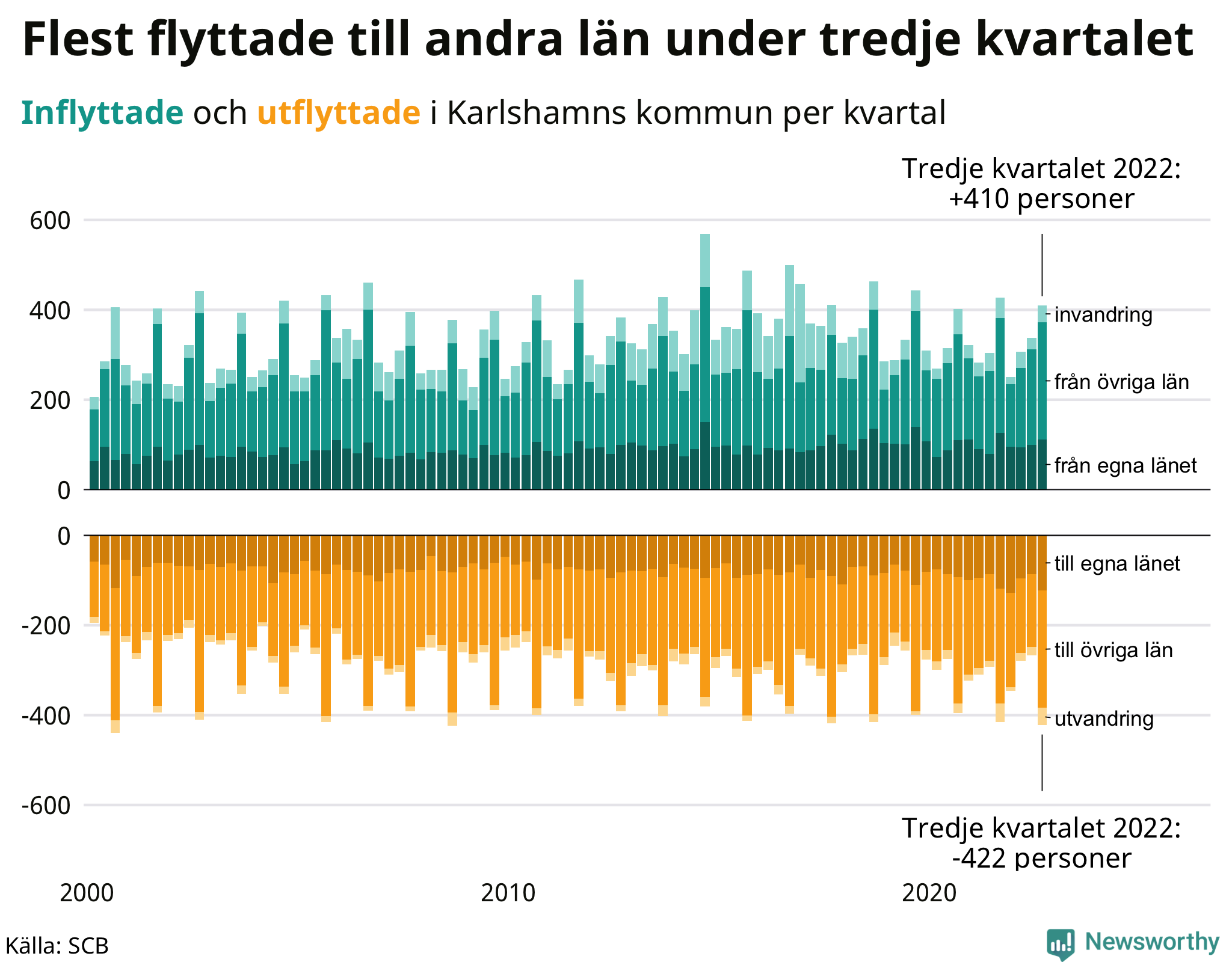 Under det tredje kvartalet flyttade 410 personer till Karlshamn medan 422 flyttade ut. Kommunen hade med andra ord ett negativt flyttnetto. Det har det oftast inte varit historiskt sett.