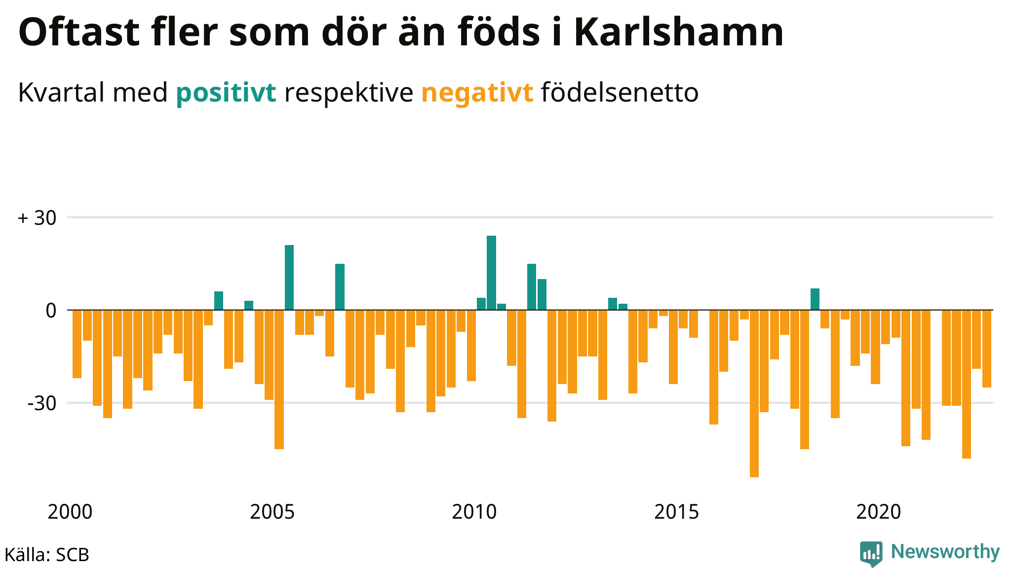 Det föddes 72 barn i Karlshamn under tredje kvartalet, medan 97 personer avled. Det innebär att Karlshamn hade ett negativt födelsenetto, vilket kommunen nästan alltid brukar ha.