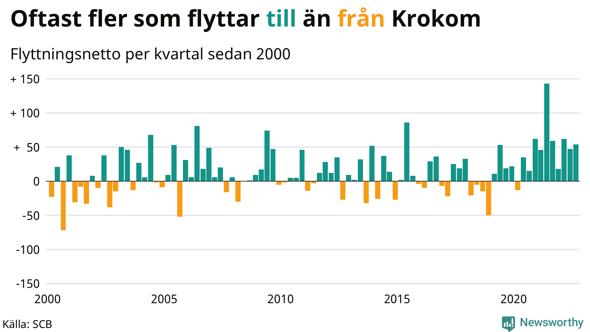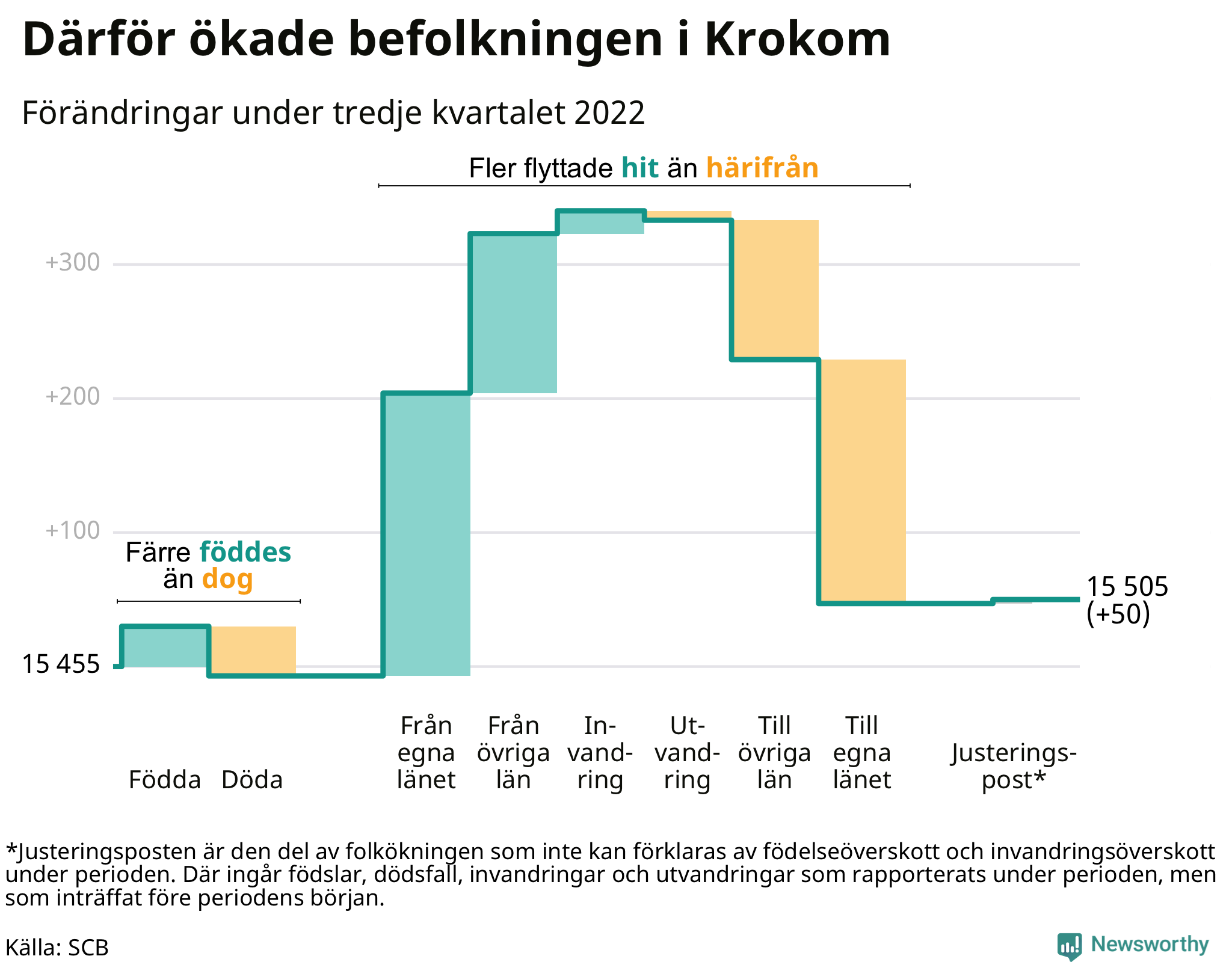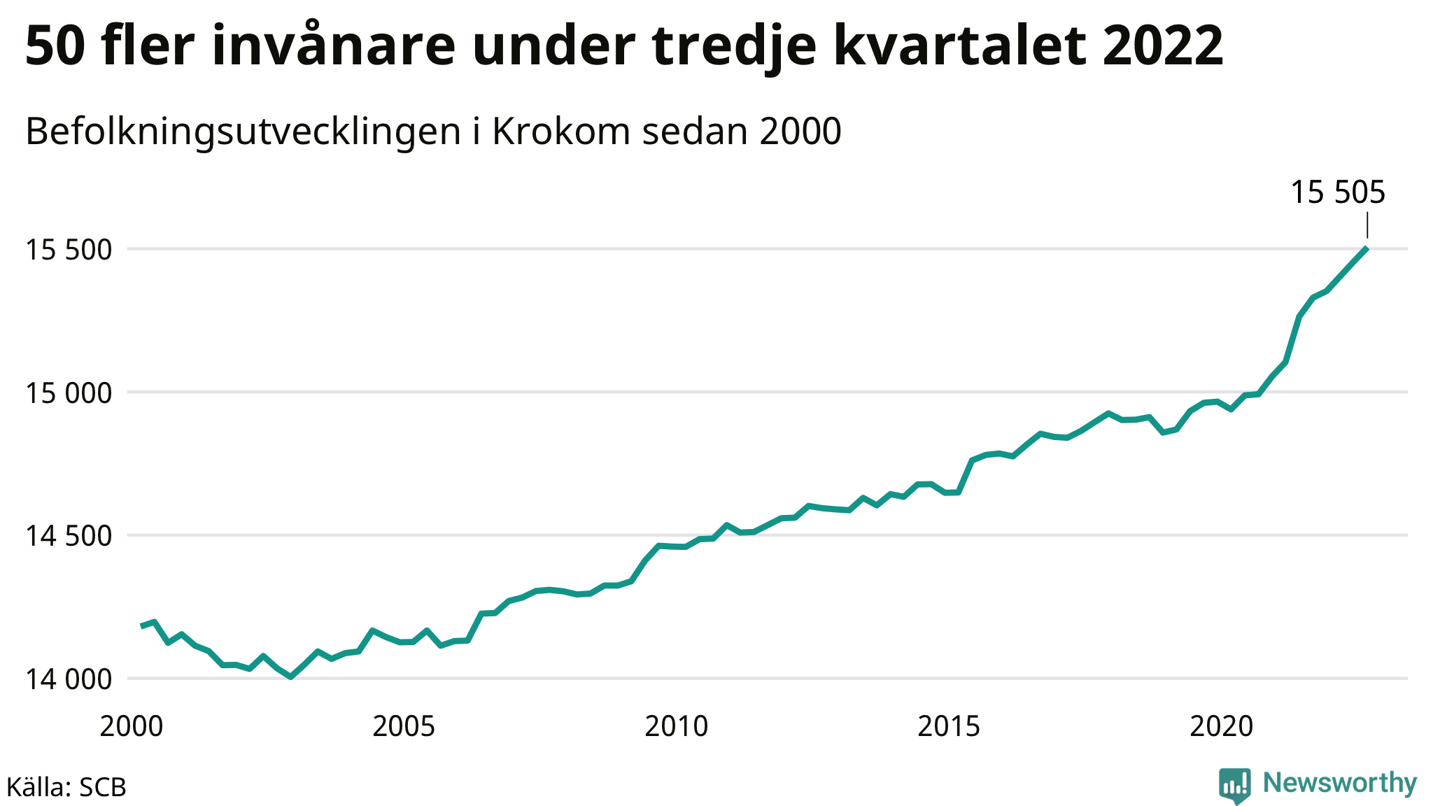 Fler dog än föddes i Krokoms kommun under tredje kvartalet 2022 – men fler flyttade till än från kommunen. Befolkningen ökade med 50 personer jämfört med kvartalet innan. Därmed har Krokom 15 505 invånare.