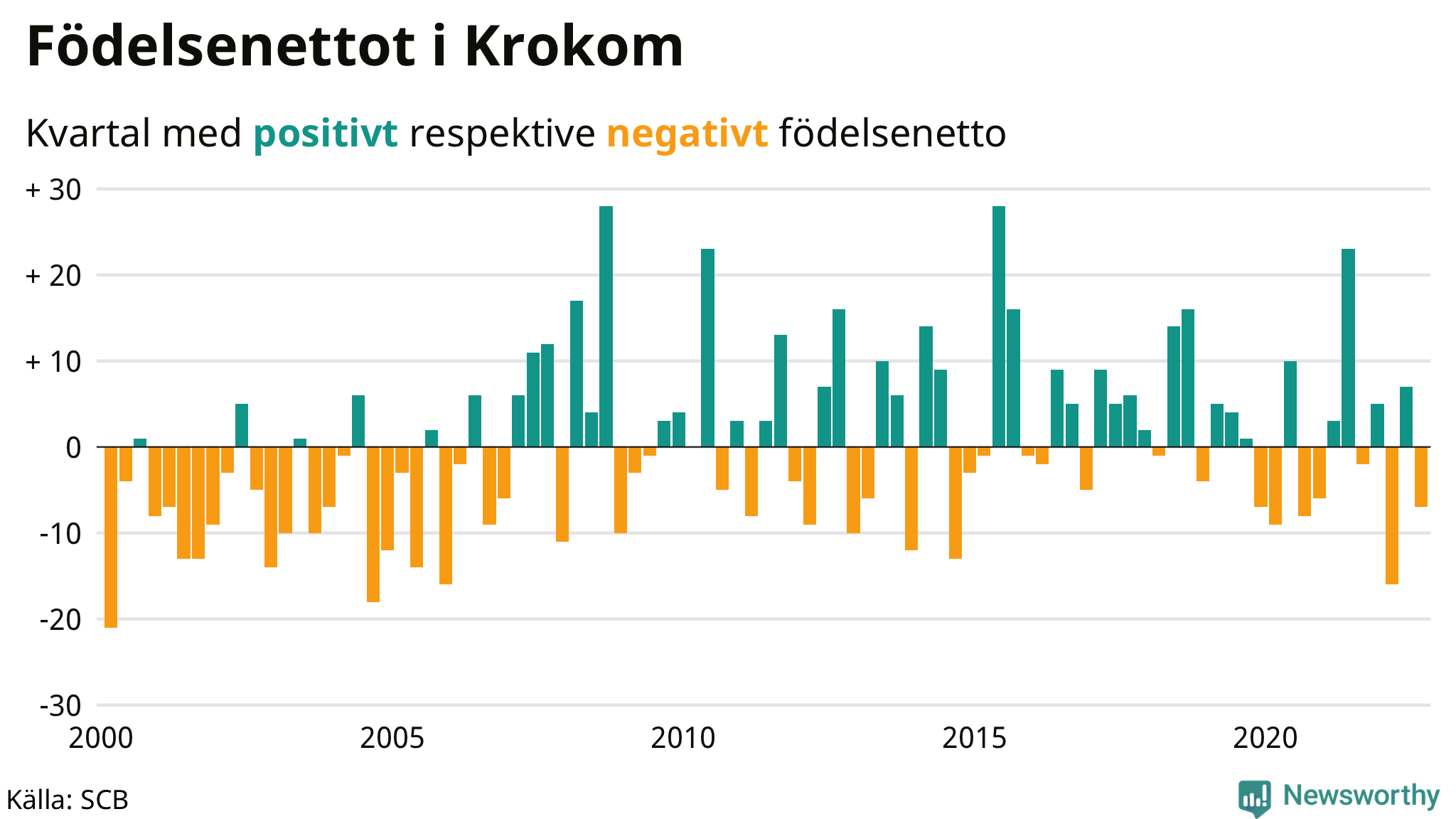 Det föddes 30 barn i Krokom under tredje kvartalet, medan 37 personer avled. Det innebär att Krokom hade ett negativt födelsenetto, vilket kommunen brukar ha.