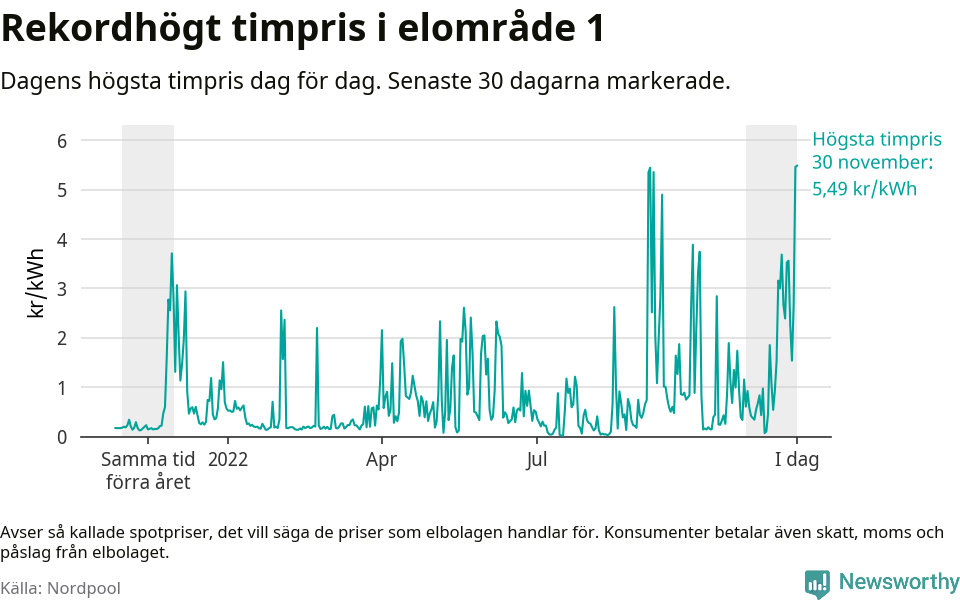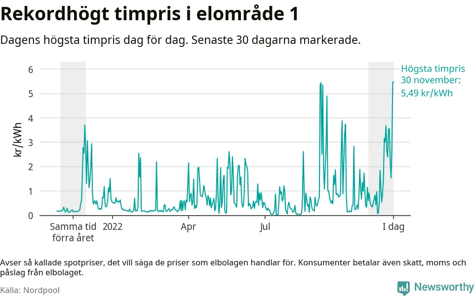 Hushåll och företag i Skellefteå med timdebiterade avtal betalar som mest 5,49 kronor per kWh mellan klockan 17 och 18 då timpriset är som högst. Det är också historiskt högt. Priset under topptimmen är den högsta noteringen hittills.