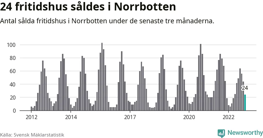 Sammanlagt såldes 24 fritidshus i Norrbottens län mellan september och november till ett genomsnittligt pris på 1,2 miljoner kronor. I fjol gjordes 45 affärer vid den här tiden på året.