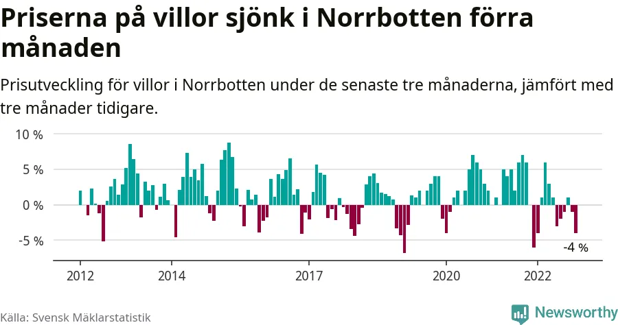 Statistiken visar även på en kännbar prisnedgång i Norrbottens län. Medelpriset på försäljningarna av villor i länet var 4 procent lägre än för tre månader sedan. Även i hela Sverige sjunker villapriserna. I hela riket noterades en prisnedgång på 8 procent.