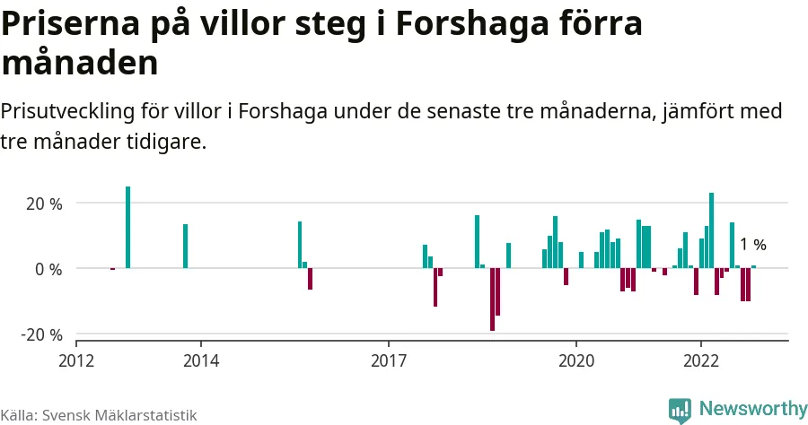 Statistiken visar även på en prisuppgång i Forshaga kommun. Medelpriset på försäljningarna av villor i kommunen var 1 procent högre än för tre månader sedan. I hela Värmland däremot sjunker villapriserna. I hela länet noterades en prisnedgång på 9 procent.