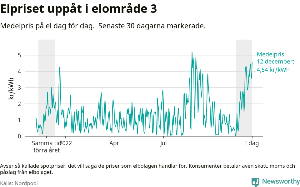Dygnspriset på el är i morgon, den 12 december, 4,54 kronor i elområde 3 på den nordiska elbörsen Nordpool. Det är det fjärde högsta dygnspriset sedan 2019 och högre än någon dag under förra vintern. Jämfört med i dag stiger elpriset med hela 0,98 kronor kWh.