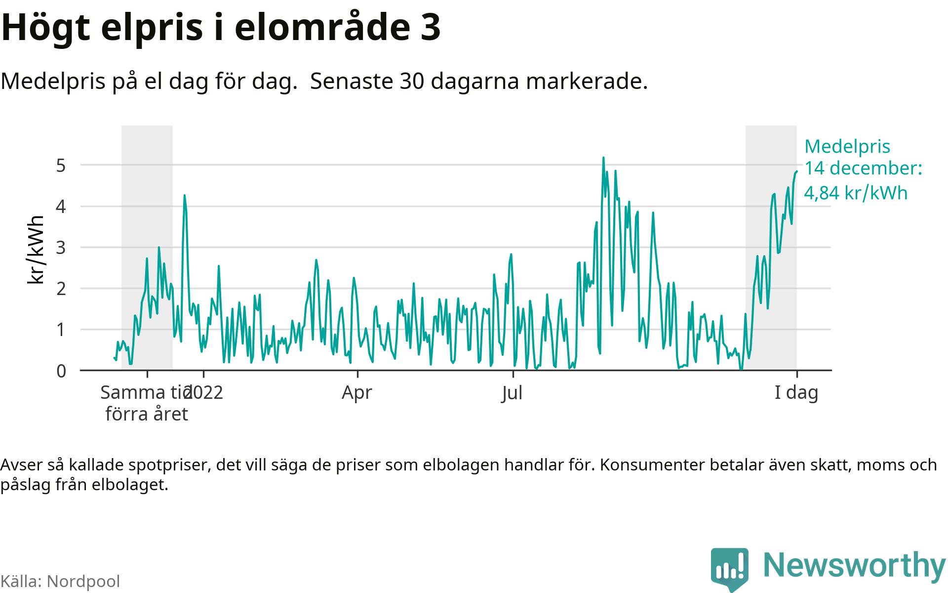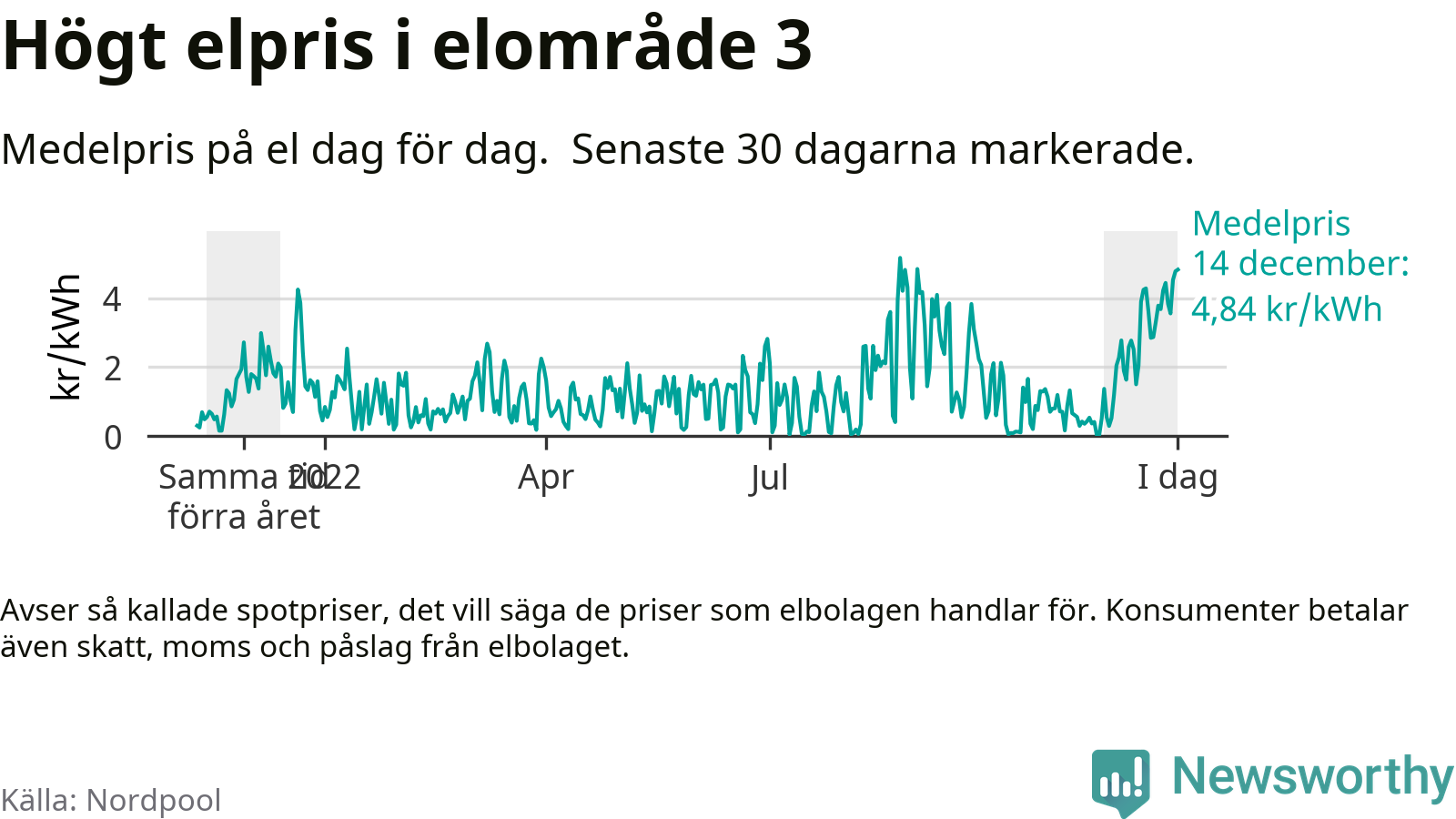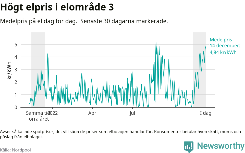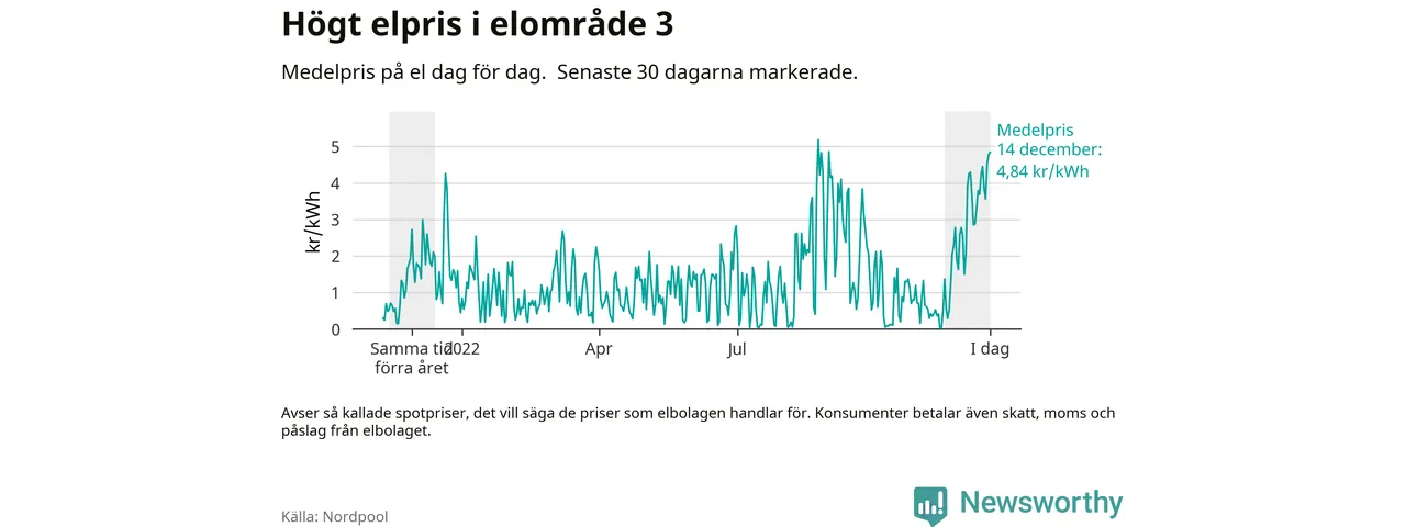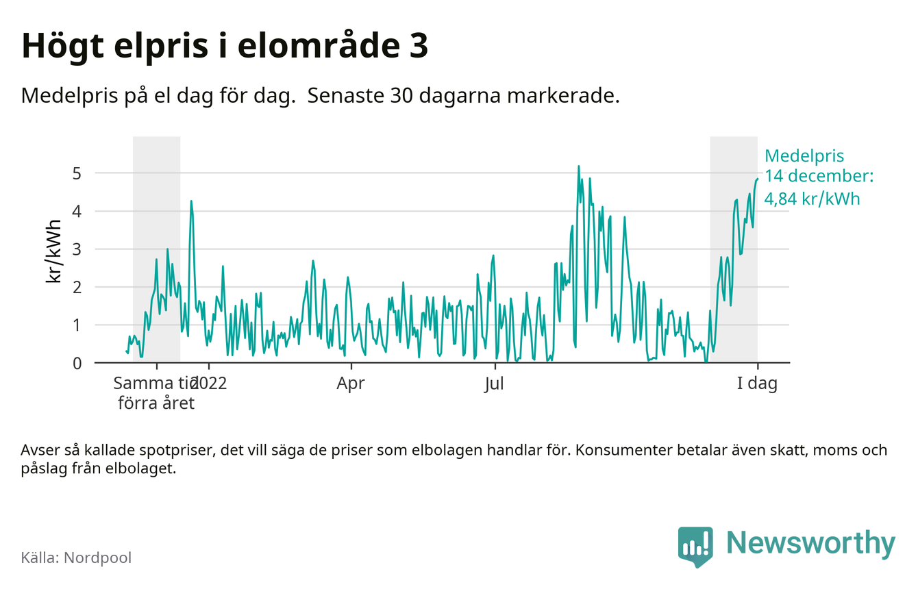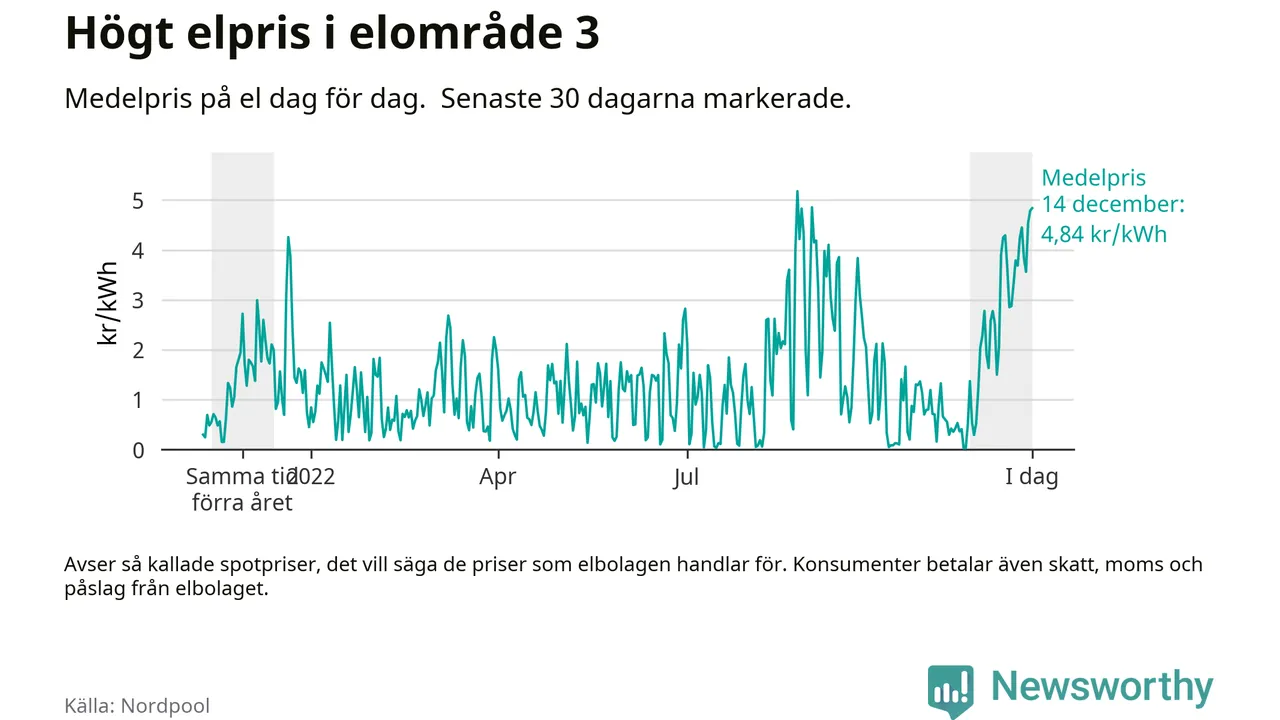 Dygnspriset på el är i morgon, den 14 december, 4,84 kronor i elområde 3 på den nordiska elbörsen Nordpool. Det är det tredje högsta dygnspriset sedan 2019 och högre än någon dag under förra vintern.