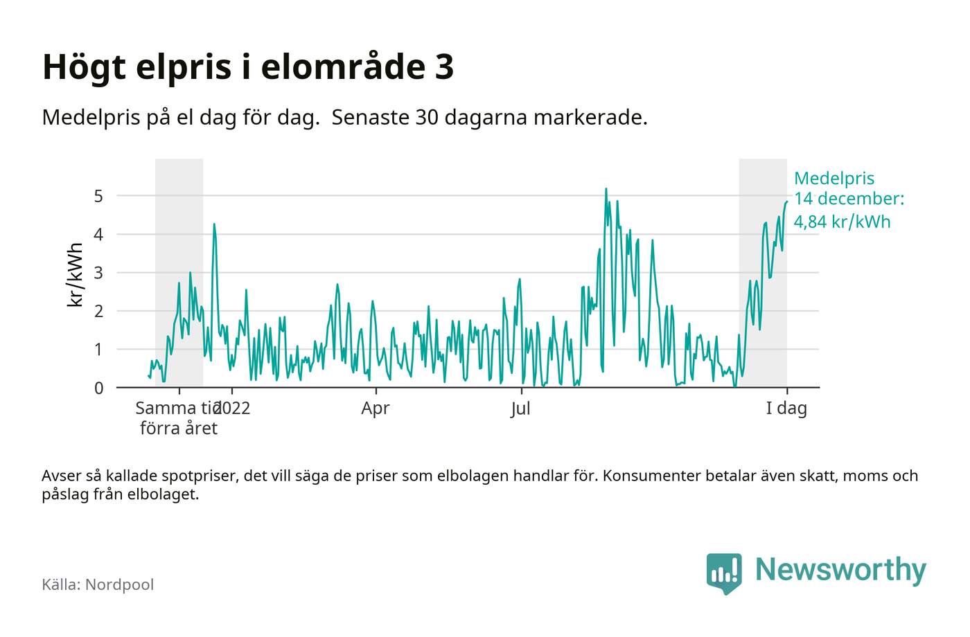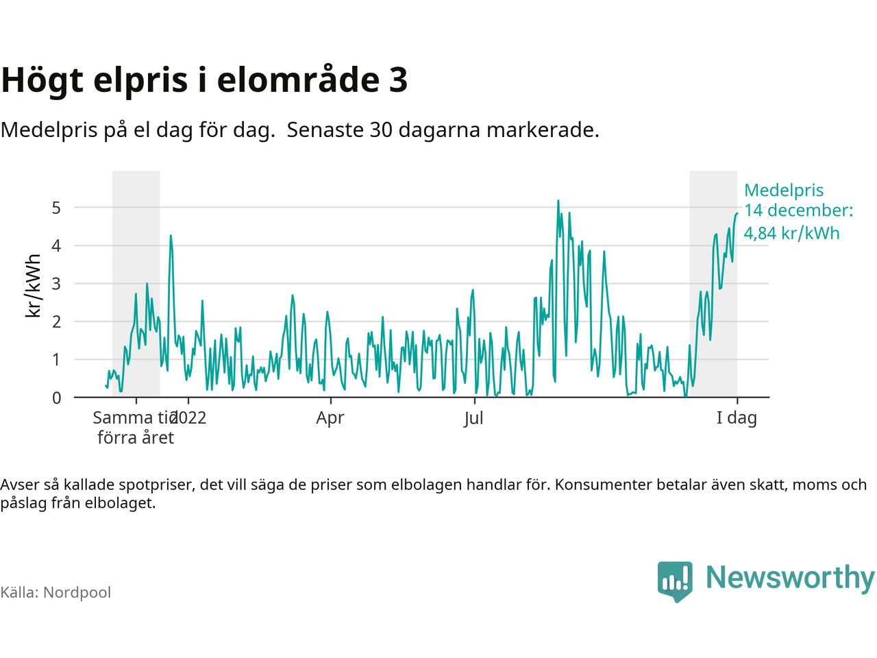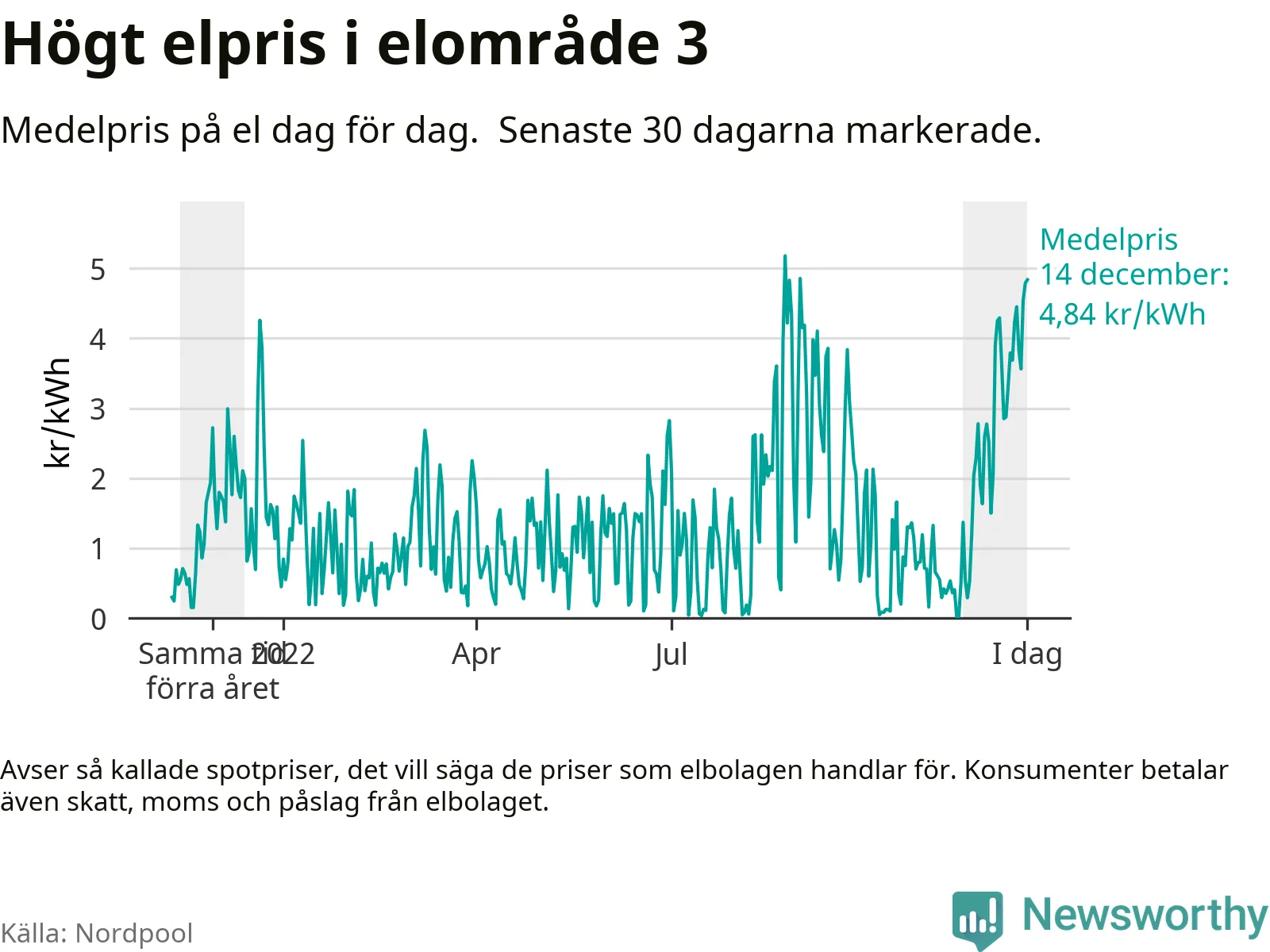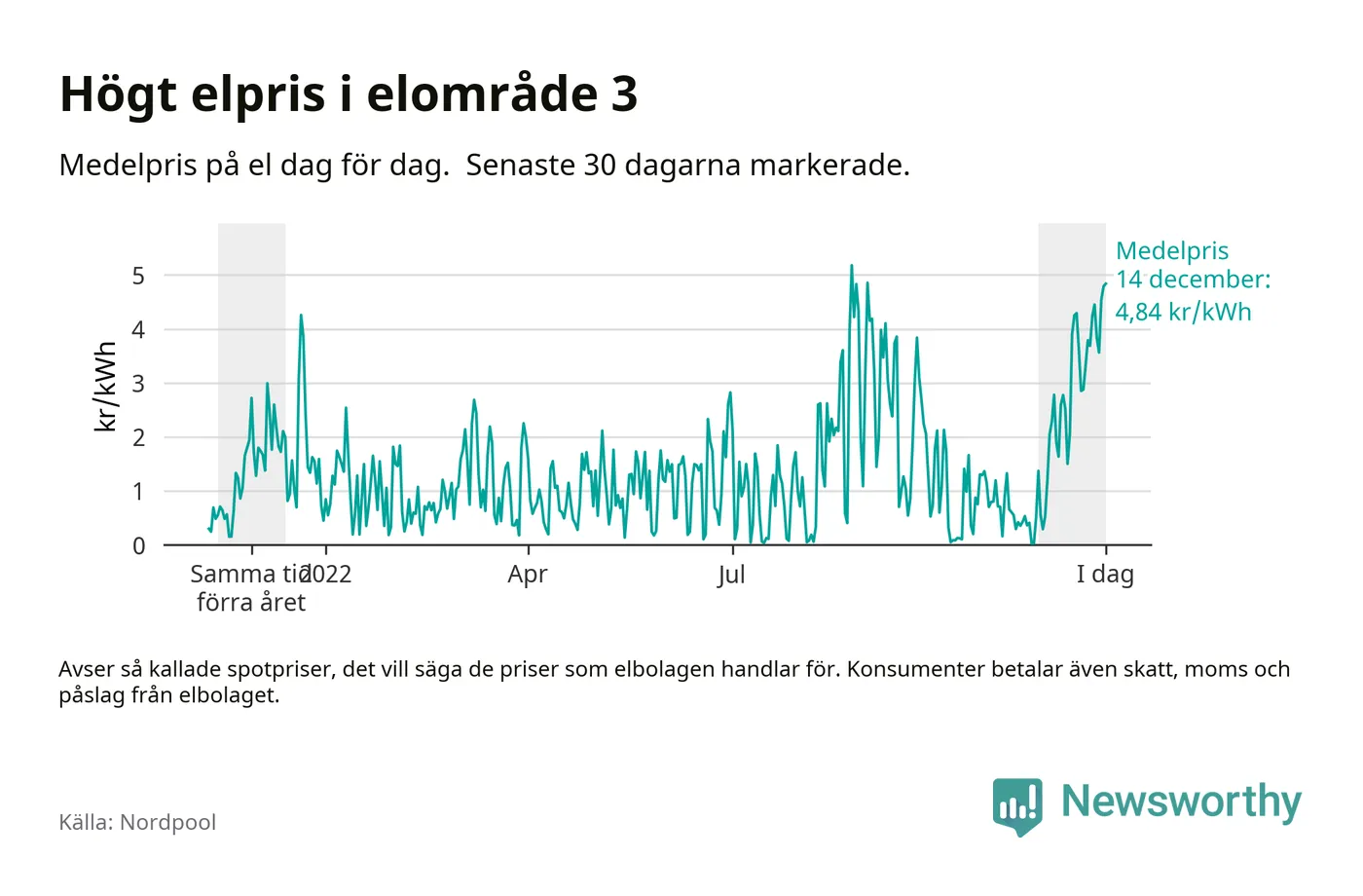 Dygnspriset på el är i morgon, den 14 december, 4,84 kronor i elområde 3 på den nordiska elbörsen Nordpool. Det är det tredje högsta dygnspriset sedan 2019 och högre än någon dag under förra vintern.