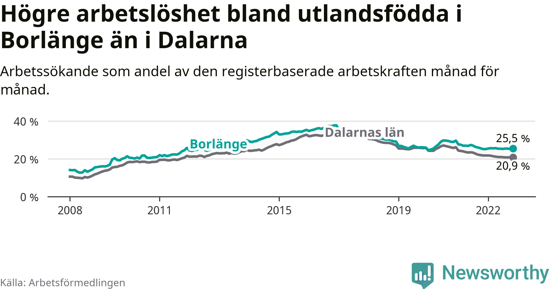 Arbetslösheten bland utlandsfödda var 25,5 procent i Borlänge under november månad, motsvarande 1 325 av 5 196 personer. Det är 0,3 procentenheter fler än vid samma tidpunkt i fjol (+12 om man räknar personer). Den senaste månadens uppgång innebär ett trendbrott. Under de 18 föregående månaderna hade arbetslösheten bland utlandsfödda varit lägre än motsvarande tidpunkt året innan.