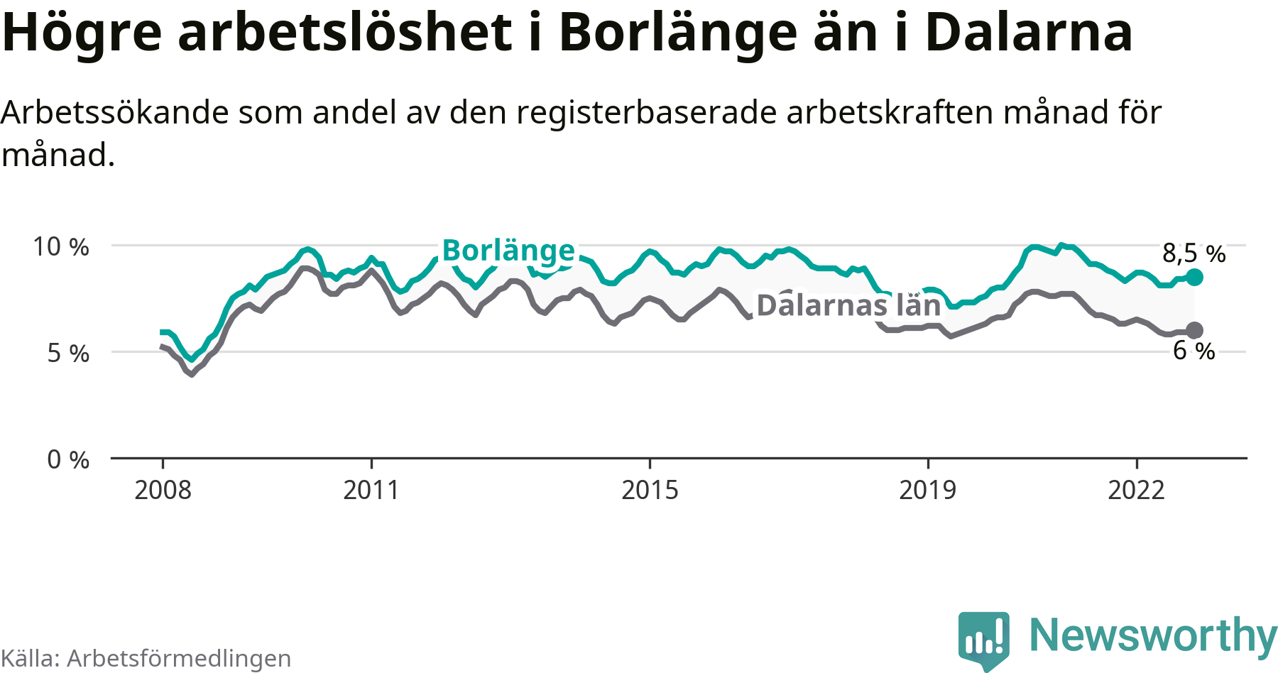 Borlänge hade redan tidigare högre arbetslöshet än snittet i hela Dalarnas län och nu växer klyftan (8,5 procent i kommunen, jämfört med 6,0 procent i hela länet). Gagnef har den lägsta arbetslösheten i länet (3,3 procent), medan Avesta har den högsta (8,6 procent). För att Borlänge skulle komma ner i samma arbetslöshetsnivå som Gagnef skulle 1 295 personer behöva sysselsättas.