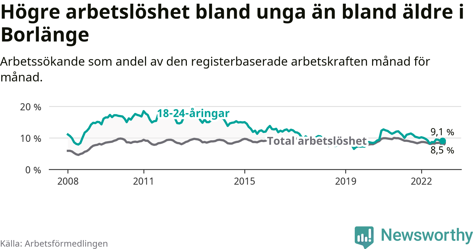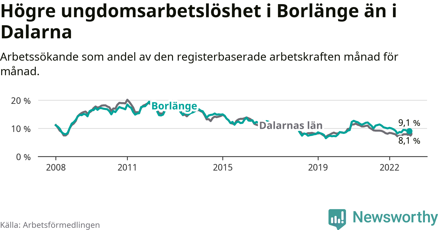 Precis som den totala arbetslösheten ligger ungdomsarbetslösheten i Borlänge högre än i Dalarna som helhet. Skillnaden mellan kommunen och länet är 1,0 procentenheter.