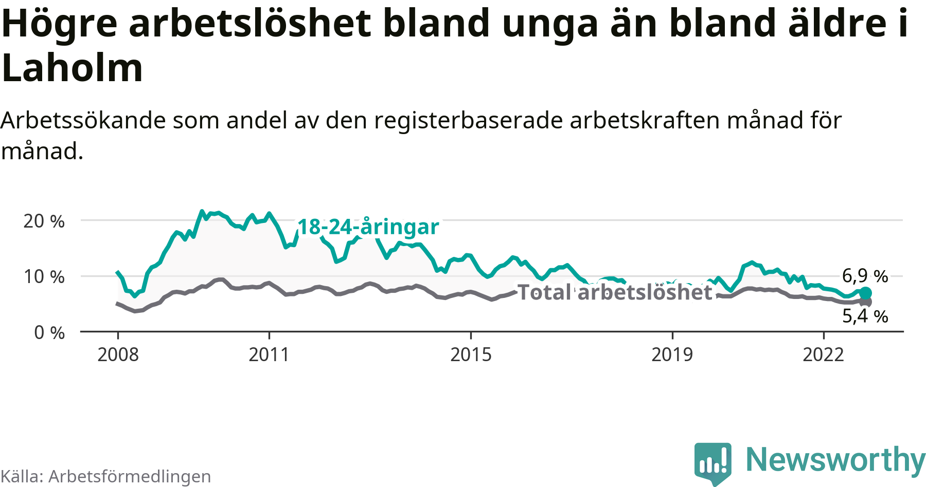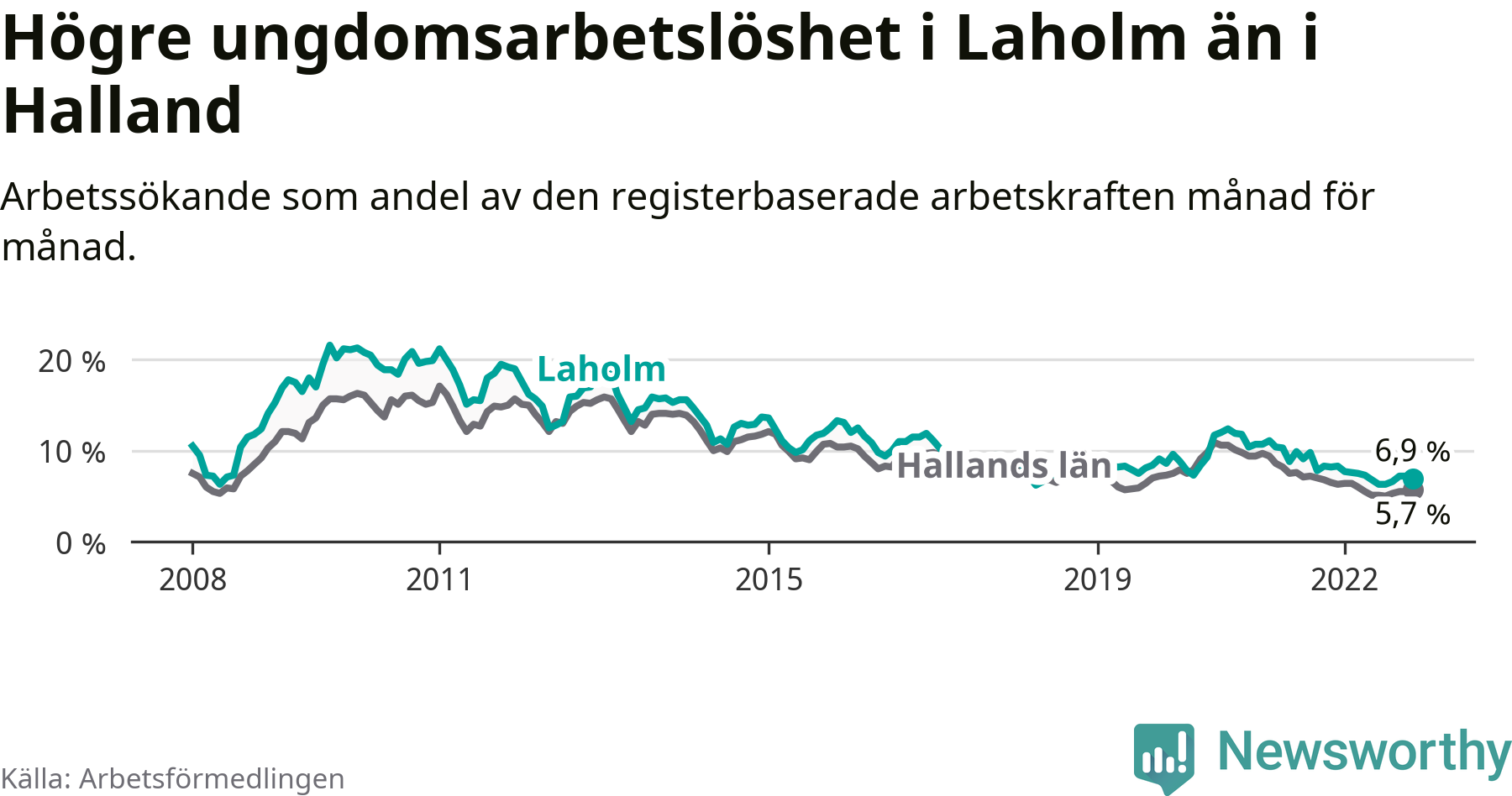 Precis som den totala arbetslösheten ligger ungdomsarbetslösheten i Laholm högre än i Halland som helhet. Skillnaden mellan kommunen och länet är 1,2 procentenheter.